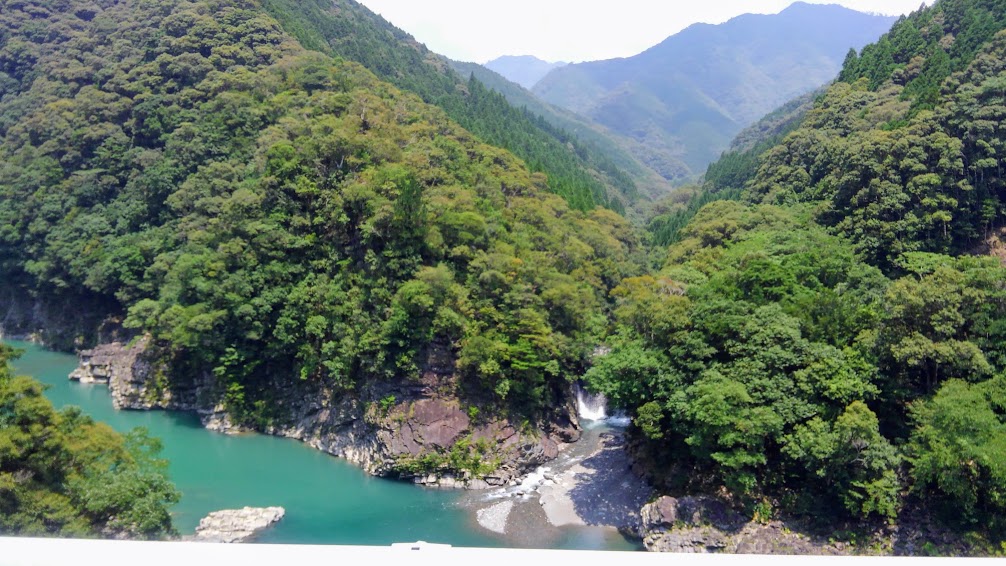 遙か眼下に、涼しげな滝と川が見えるのですが・・・