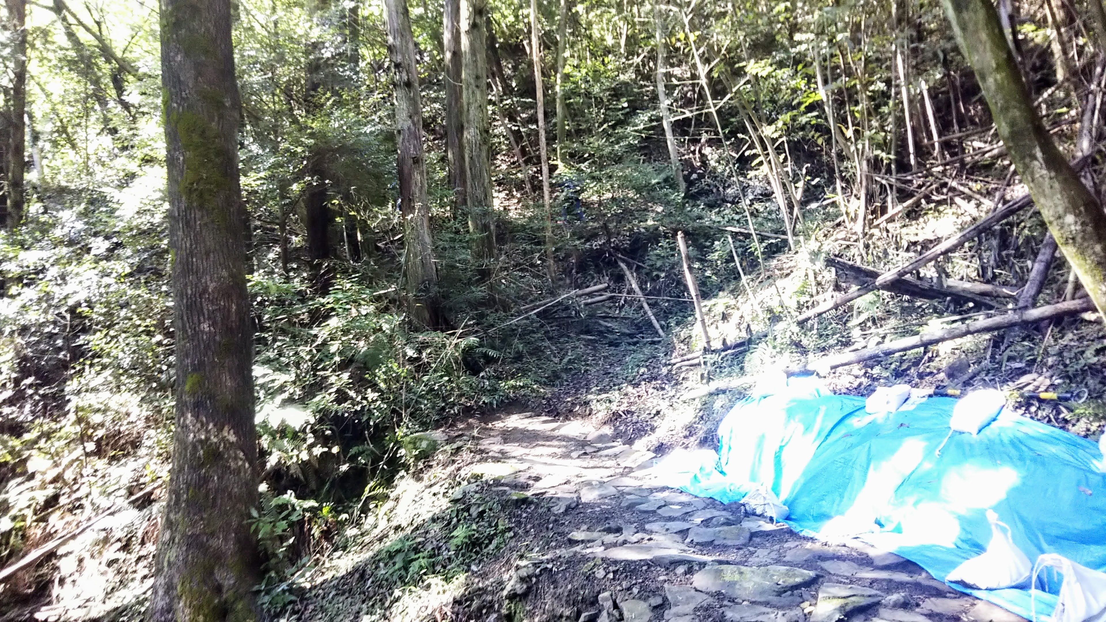 5時に起床し、テント撤収、洗濯物の取込、朝食を済ませ、出発準備をした後、東屋周辺の清掃をさせていただきました。 6時48分に出発しましたが、辺りはまだ朝靄に包まれ、朝日がハレーションしていました。 まず、県道299号線沿いの歩き遍路道を進み一本松を目指しますが、いきなり崩れかかったかつての民家の庭先を通過するようにGPSは表示しています。 歩き遍路道の表示がでていなければ決して通ることのないような道を進みます。 第一関門をクリアし県道299号線に戻ってきましたが、GPSによると、この辺りから歩き遍路道に分岐しなくてはならないのですが見当たりません。